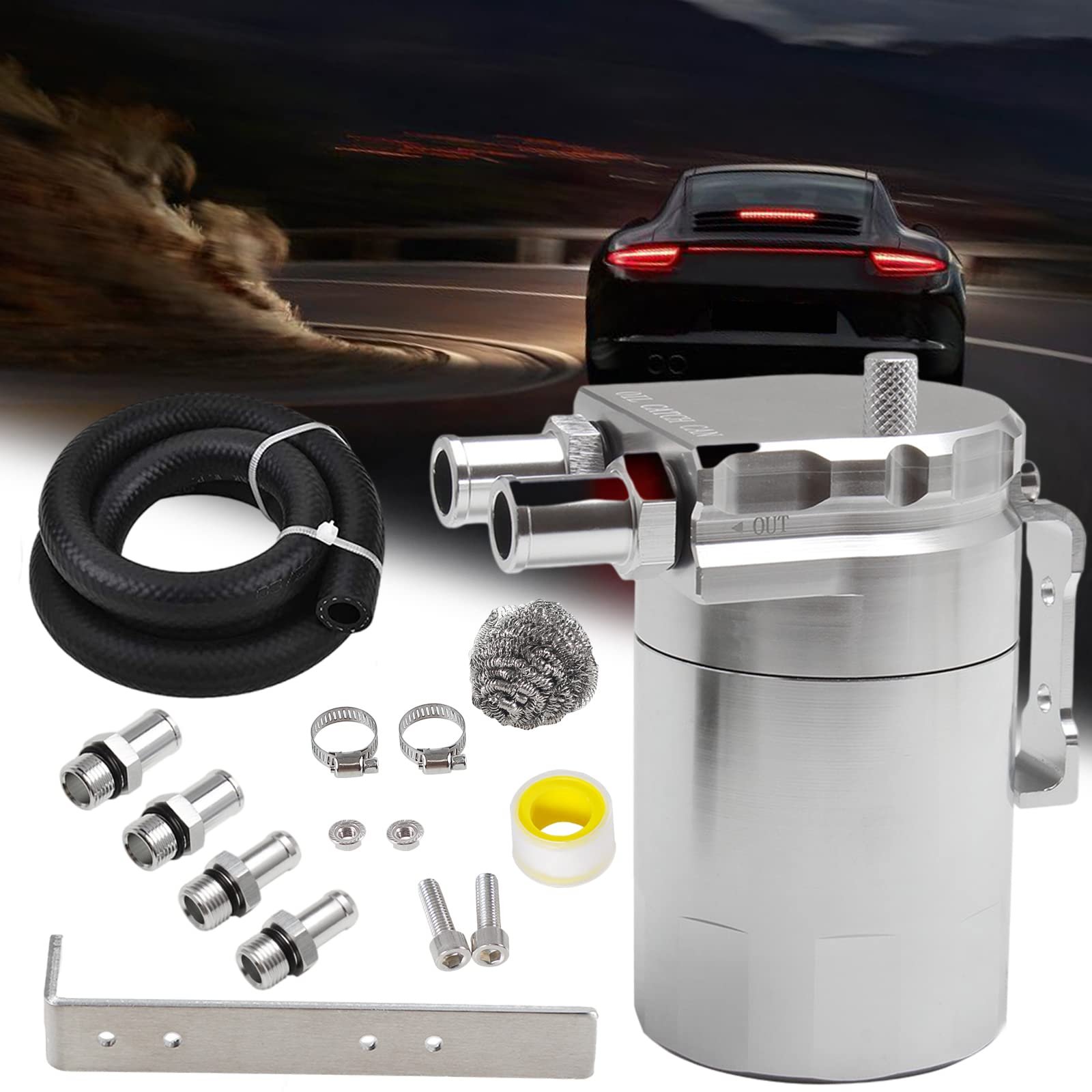 Upgraded Baffled Oil Catch Can with Breather Filter Kit Aluminum Oil Reservoir Tank with 3/8″ Strengthened NBR Fuel Line