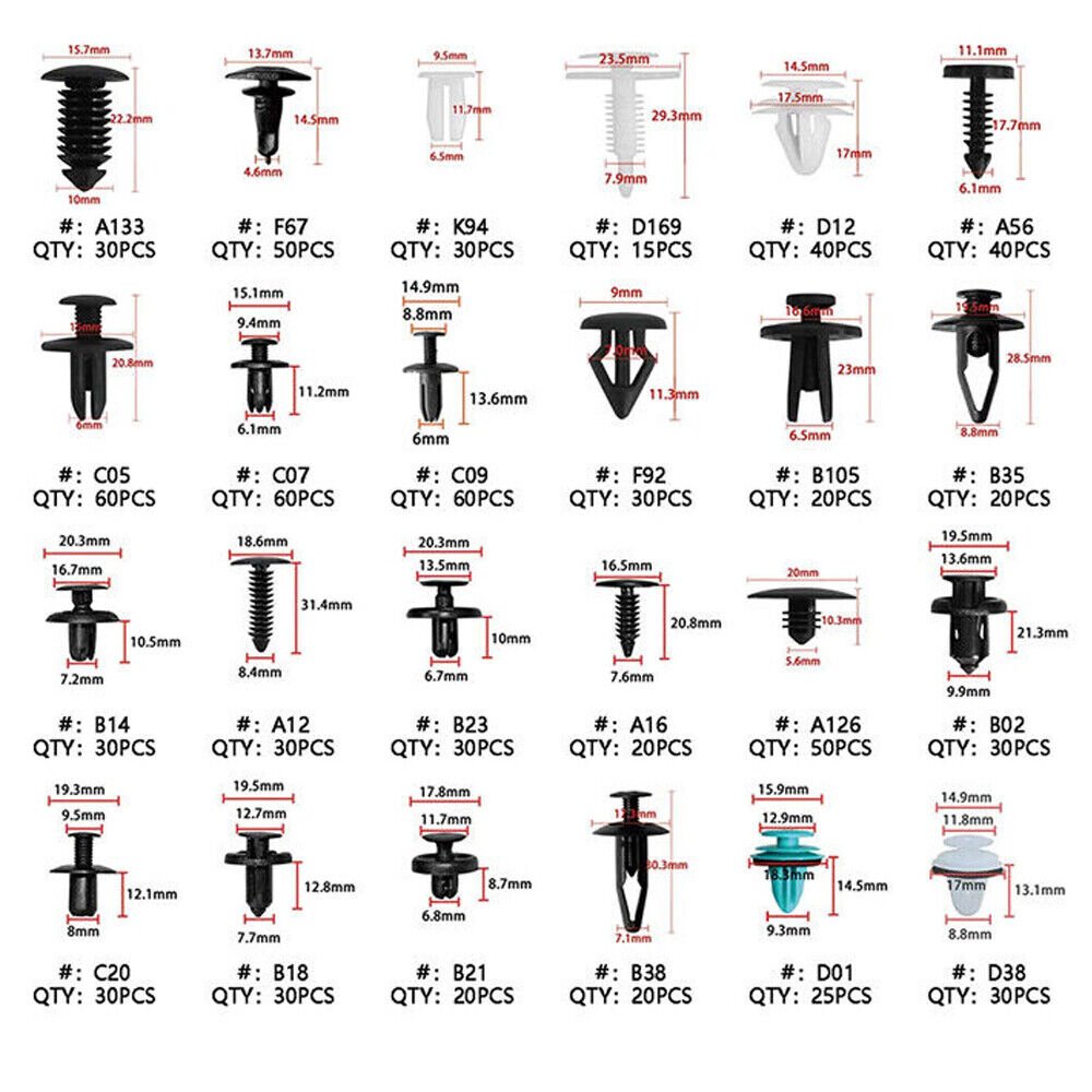 1.24 sizes: The package includes 24 most popular sizes for Universal various models . such as Toyota Nissan Ford GM. etc. Equipped with 1 fastener remover. perfect for installing or removing car stereo. door panels. trim. and window trim system. it can solve your problem quickly.