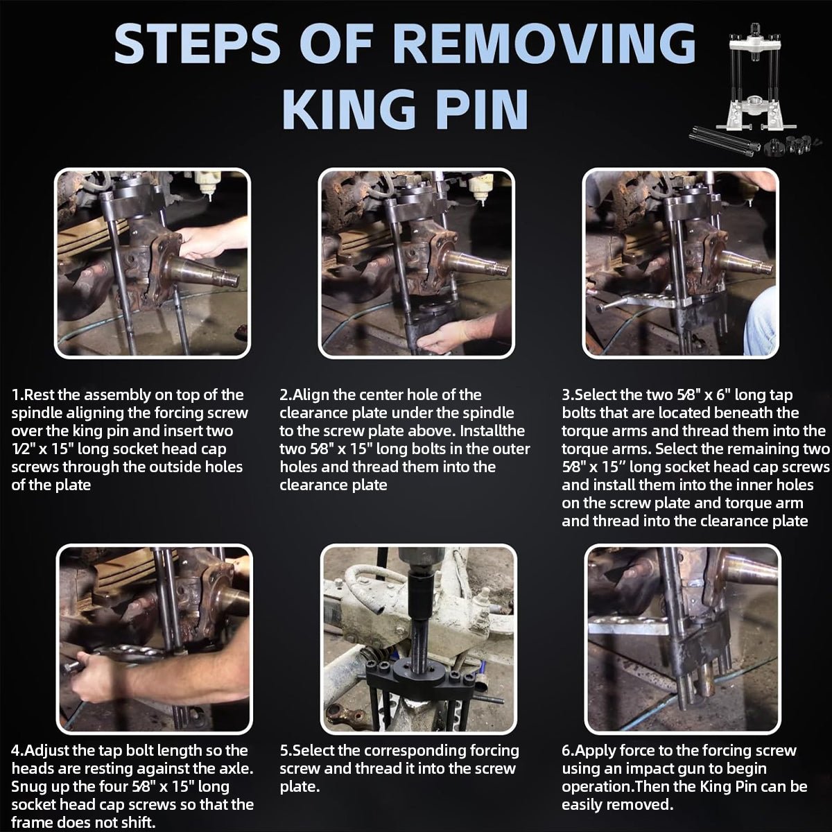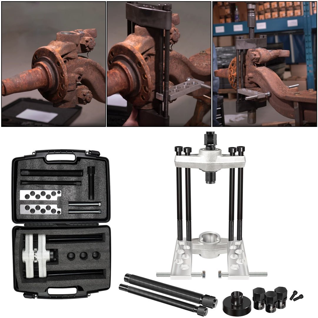 Efficient & Easy King Pin Removal: Tool King Pin Press (part number 90150) revolutionizes king pin maintenance by enabling the removal of king pins within minutes. requiring only a single operator. This tool brings unparalleled efficiency and ease to what was once a labor-intensive task. making it an essential tool for servicing medium and heavy-duty trucks.