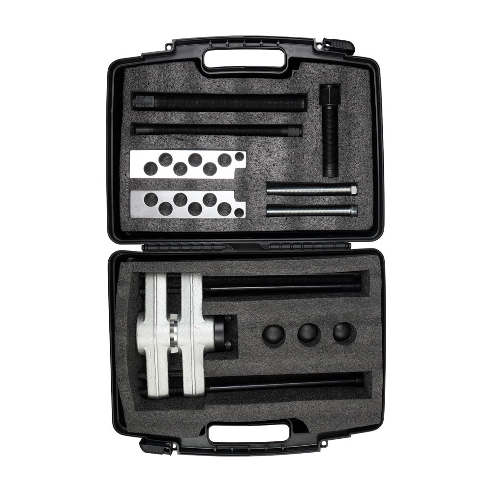 Powerful & Optimized Design: Despite its qualified 46.000 lbs of force capability. the King Pin Press maintains a lightweight design at just 30 lbs. Anti-torque arms prevent twisting under extreme force. and optimized diamond-shaped end plates made from high-grade steel reduce the tool’s mass without compromising strength. ensuring durability and ease of use.