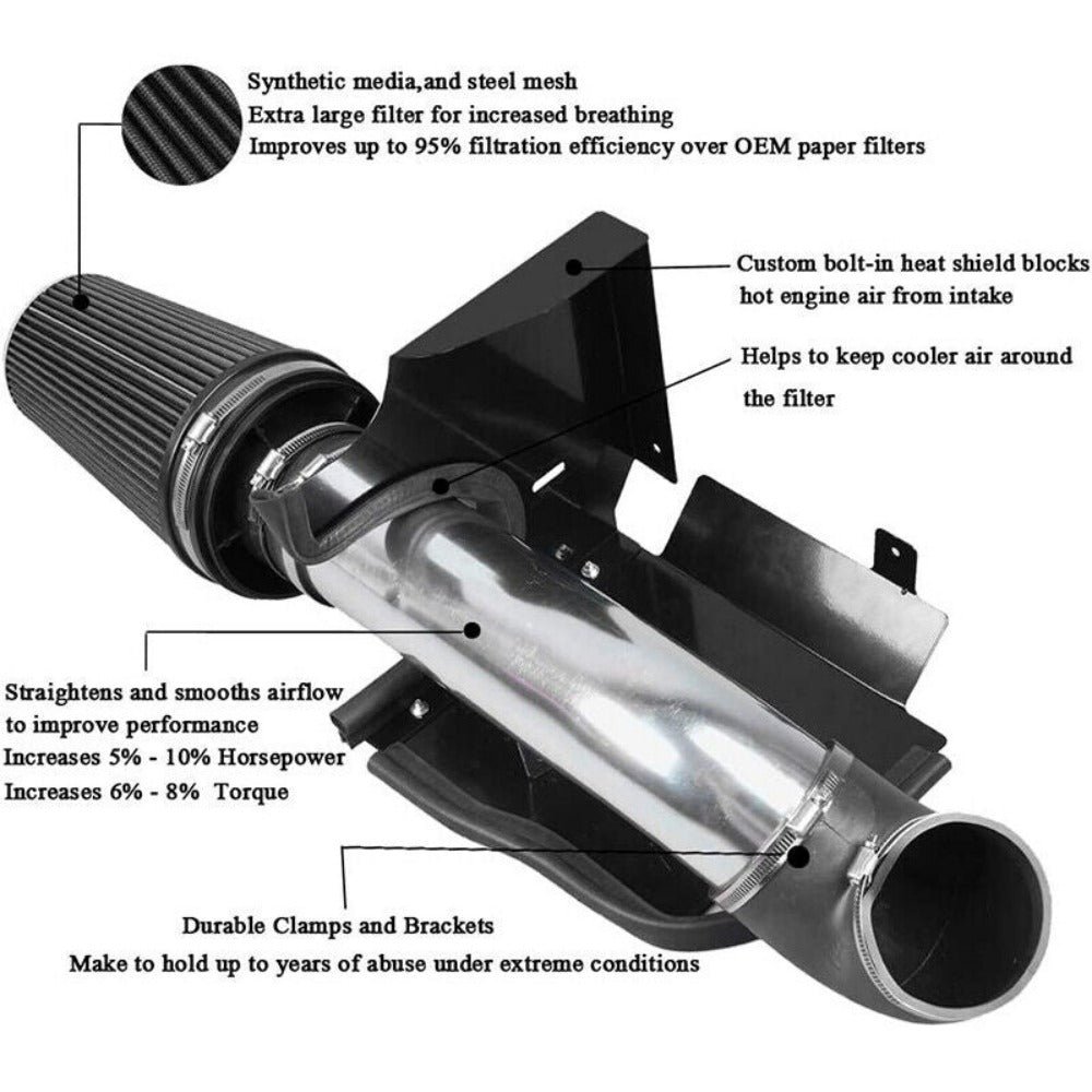 Upgrade: Our cold air intake kit effectively increases horsepower by 5-10%. torque by 6-8%. and produces attractive intake noise. Advanced oil-filled synthetic filter design helps protect your engine from damaging contaminants.