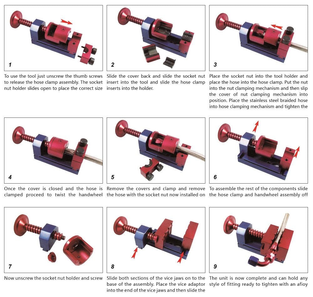 Aluminum Rotary Fuel Hose AN Fitting Installation Tool are favored by professional race teams & mechanics for assembling Hose & fittings and is an excellent choice for the Racer. Hot Rod. Muscle Car & Boat enthusiast for use in all fuel systems. cooling systems. vacuum applications and oiling systems that want to look after the finish on their Hoses to look like a Pro Installed it.