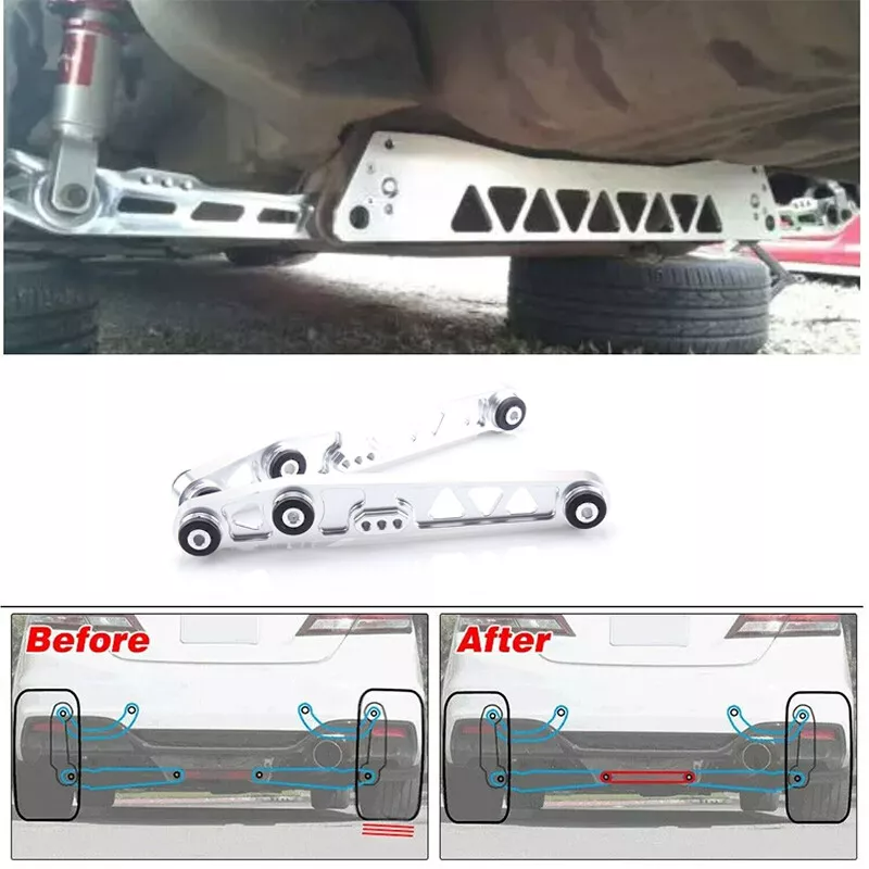Rear lower control arms with solid polyurethane bushings. Bushings are made of solid polyurethane which are stronger. lasts longer. and far outperforms rubber.