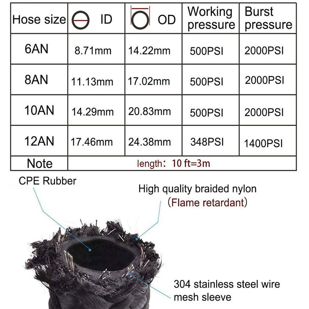 Size ID of 10an fuel hose:0.56″(14.22mm).OD:0.78″(19.8mm).Length:10ft.