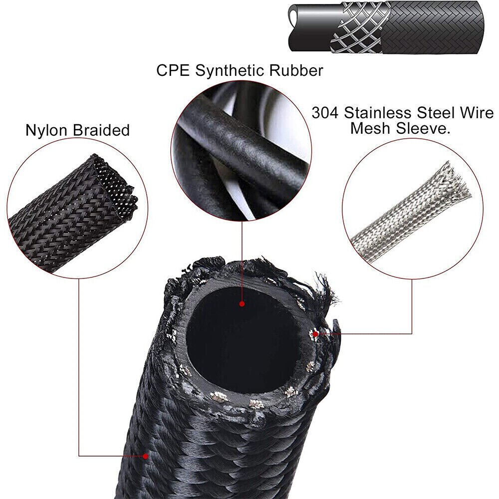 Application 10AN nylon and stainless steel braided fuel hose kit can be compatible with transmission fluid. oil. race gas. and fuel.etc.